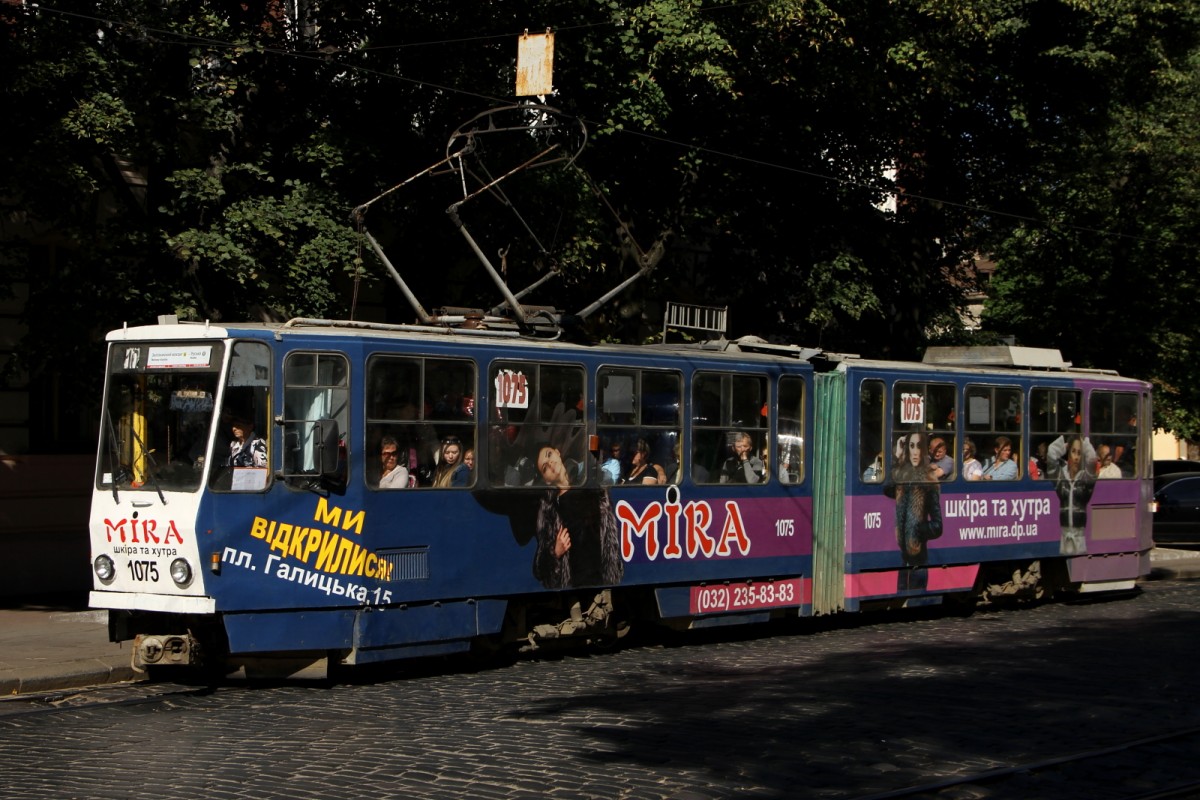 TATRA T4 mit der Nummer 1075 am 20.08.2015 in Lviv. Fotografiert an der Stefan Bandera Strasse . Werbung Mira ist für Pelz und Lederjacken.