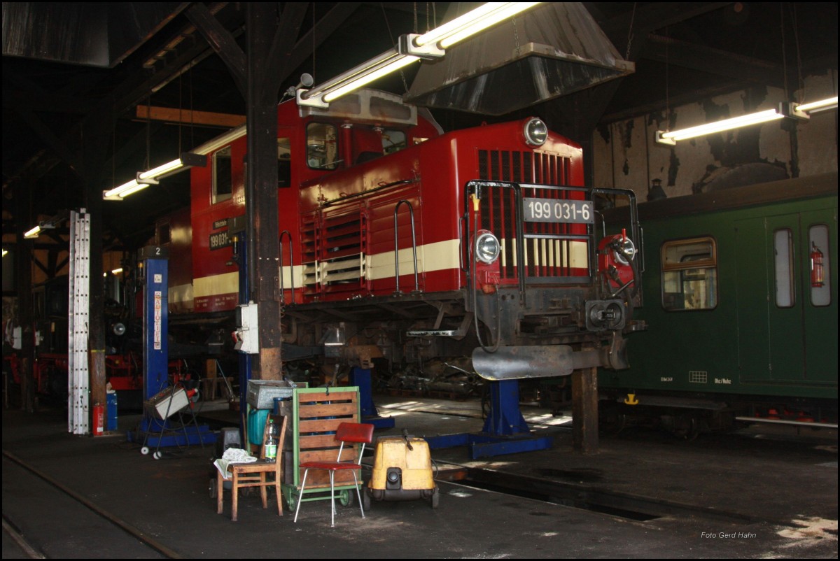 In Aufarbeitung befindet sich derzeit 199031 der Döllnitzbahn. Am 22.9.2015 stajd sie aufgebockt im Lokschuppen in Mügeln. Das Betriebspersonal war hocherfreut über mein fotografisches Interesse. Es wurde sofort ein Bildaustausch auch aus alten Zeiten vereinbart; denn vor 25 Jahren fotografierte ich an gleicher Stelle zum ersten Mal!