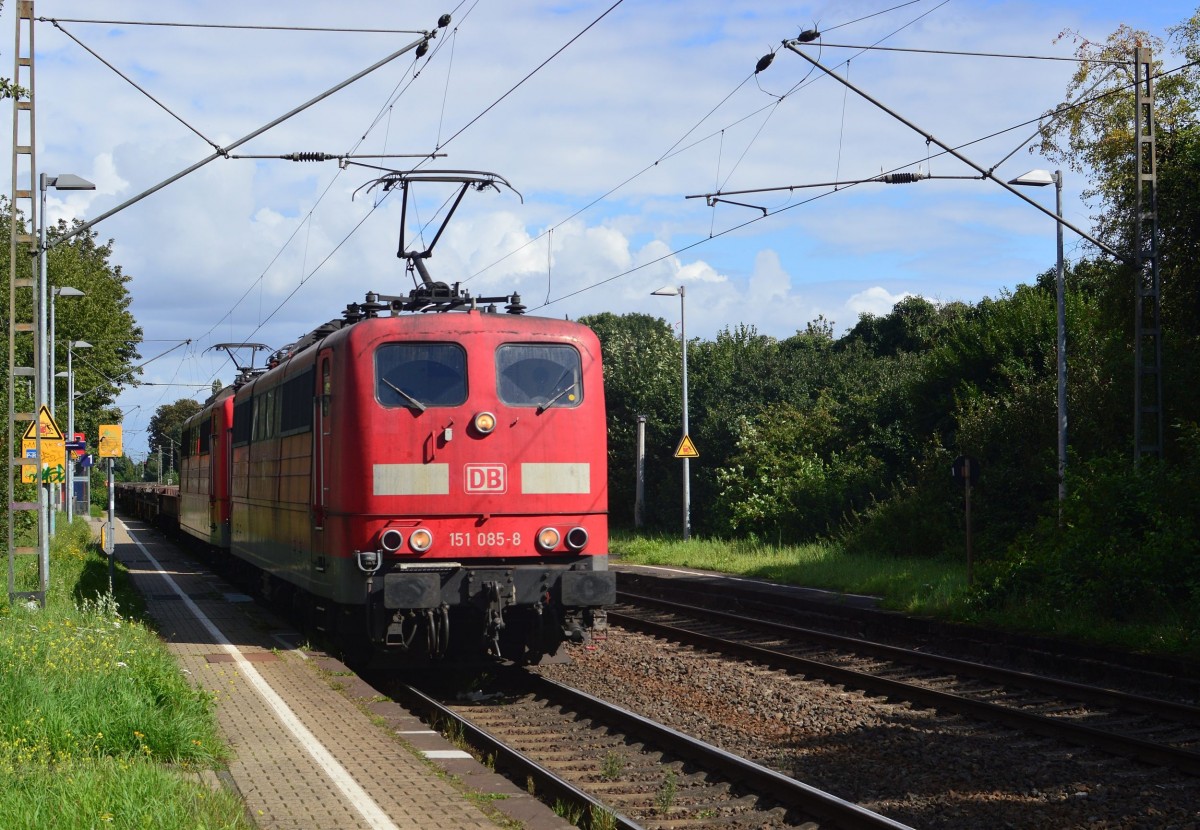 151 085-8 und die Schwesterlok 151 028-8 sind hier in Jüchen mit einem Coiltragwagenleerzug gen Rheydt fahrend von mir abgelichet worden. Sonntag 6.9.2015