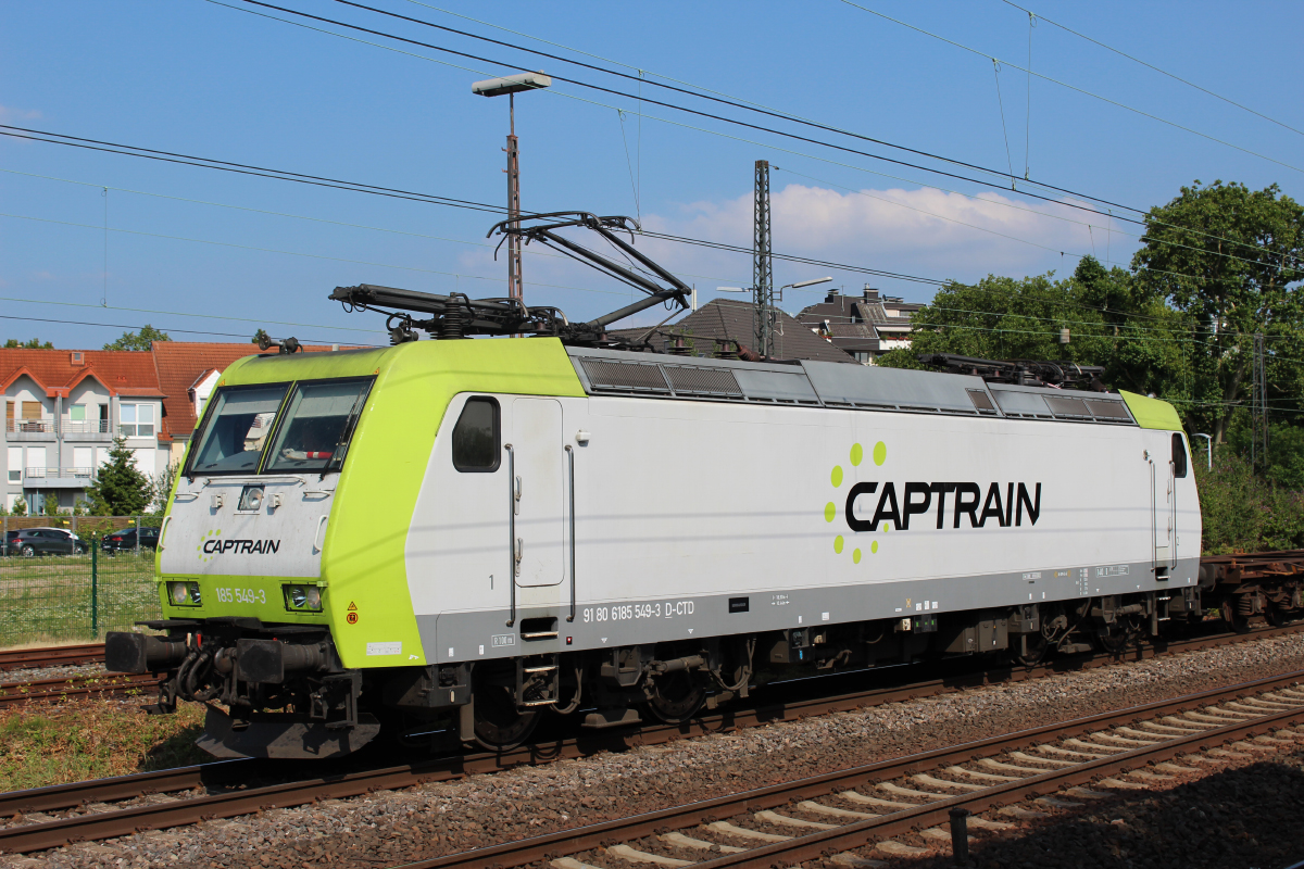 Die schwarze für Captrain fahrende 189 111 (ES 64 F4-111) zieht einen langen Güterzug durch Leutesdorf Richtung Köln. Aufgenommen am 05/06/2015.