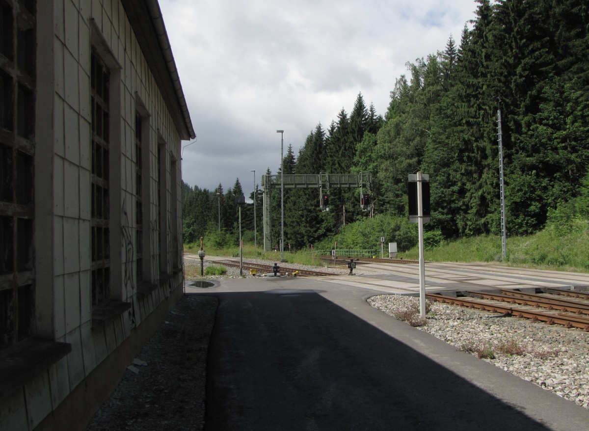Die Ausfahrt in Richtung Zella-Mehlis mit der Signalbrücke am 09.07. in Oberhof. Links erkennt man das Abstellgleis für Sonderzüge.