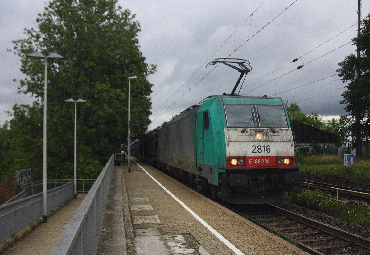 Die Cobra 2816 kommt die Kohlscheider-Rampe hoch aus Richtung Neuss,Herzogenrath mit einem sehr langen Peugeot-Citroen-Auto-Zug aus Kolín(CZ) nach Zeebrugge-Pelikaan(B) und fährt durch Kohlscheid in Richtung Richterich,Laurensberg,Aachen-West.