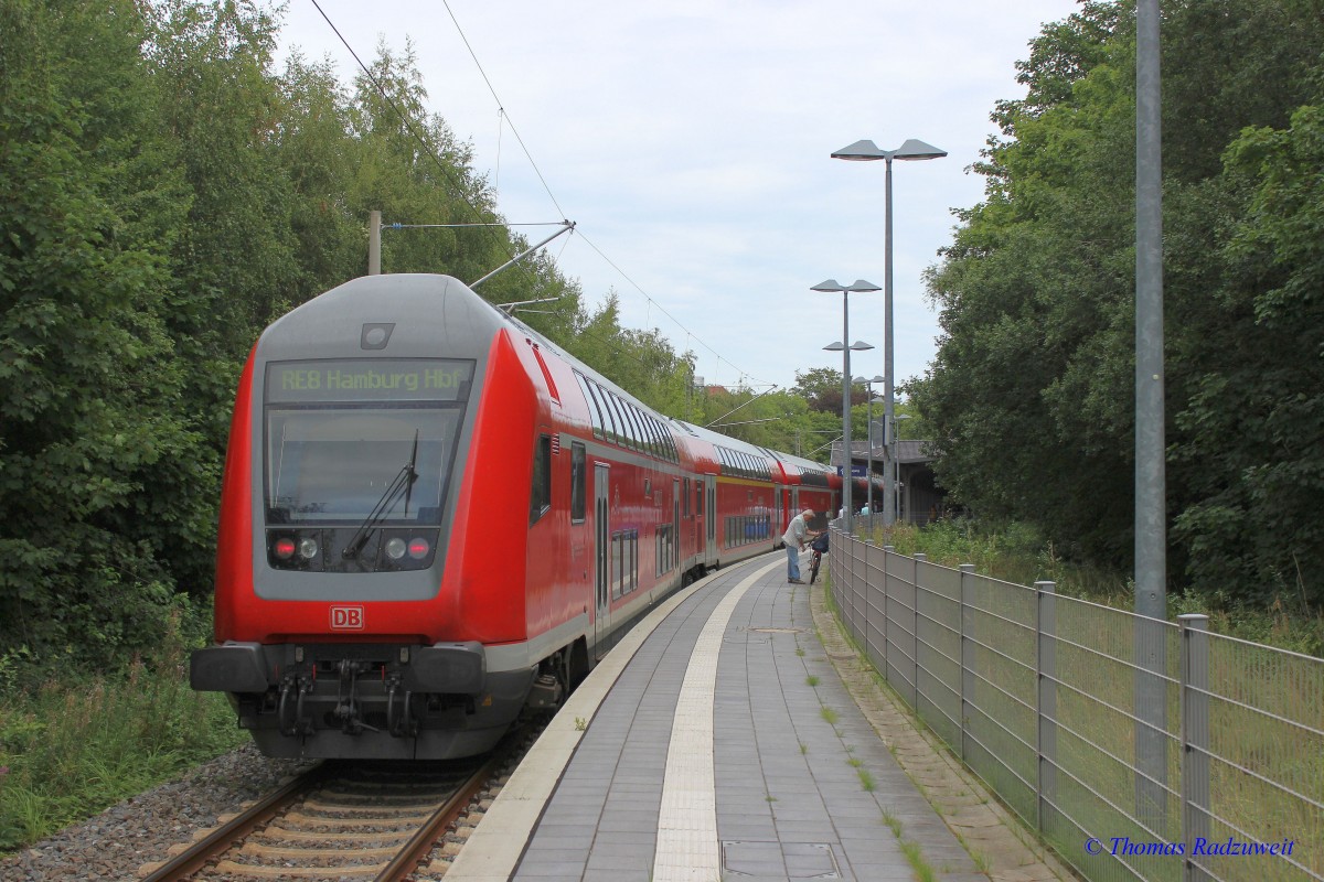 RE 21429 nach Hamburg Hbf steht am 29.8.2015 abfahrbereit in Lübeck-Travemünde Strand. Der Bahnhof wurde erheblich rückgebaut und hat jetzt nur einen Bahnsteig.