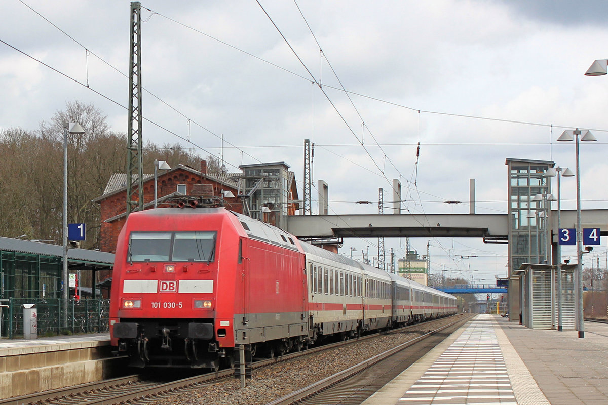 101 105-5 mit IC 2174(Hamburg-Rostock)bei der Einfahrt um 17.32 Uhr im Rostocker Hbf.01.04.2016