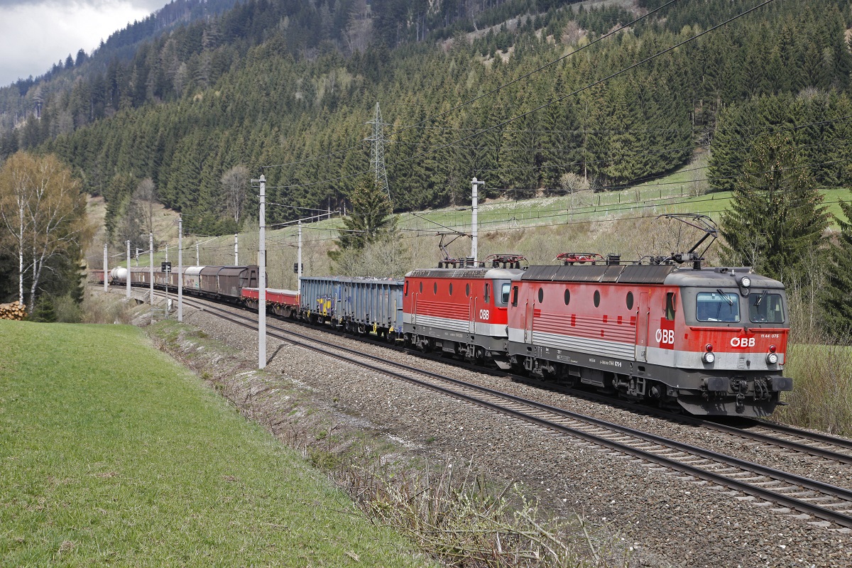 1144 075 + 1144 033 mit Güterzug bei Wald am Schoberpaß am 12.04.2016.
