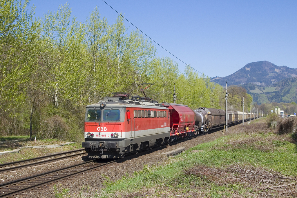 Am 11. April 2016 ist 1142 658 mit Güterzug bei Frohnleiten unterwegs.