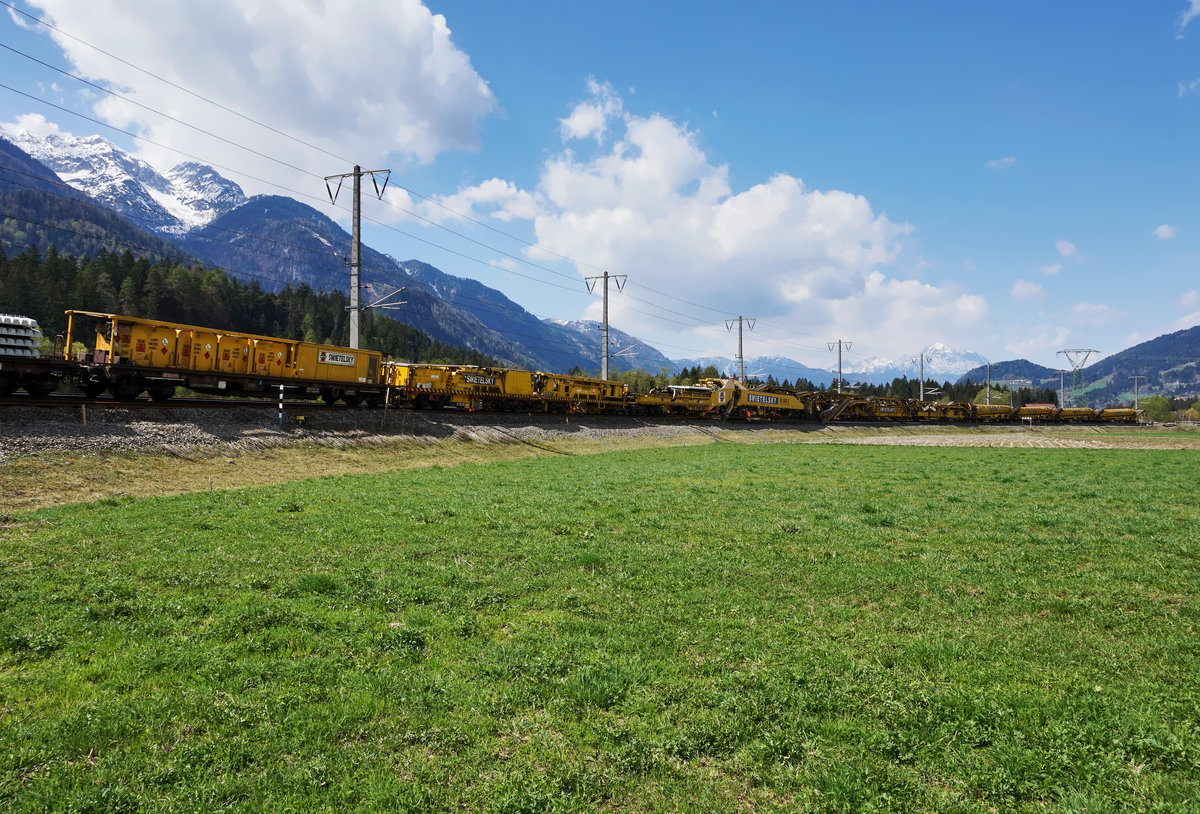 Hier zu sehen ist eine fast endlose Reihe Skks-Wagons von RTS, beladen mit den alten Gleisen. Aufgenommen am 14.4.2016 im Bahnhof Dellach im Drautal.
