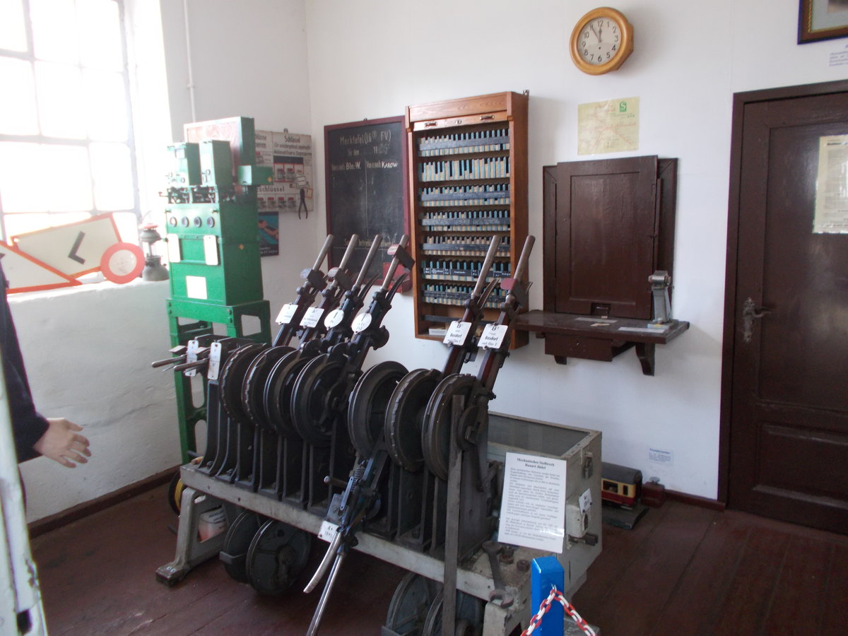 Die Berliner Eisenbahnfreunde haben,in den ehemaligen Räumen von der Est Basdorf,ein kleines Eisenbahnmuseum eingerichtet,so wird auch in einem Raum ein kleines Stellwerk mit seiner Technik gezeigt.Aufnahme vom 26.März 2016.