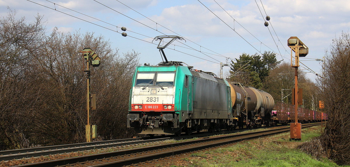 Die Cobra 2831 kommt aus Richtung Aachen-West und fährt die Gemmenicher-Rampe hochgefahren mit einem gemischten Güterzug aus Köln-Grmeberg(D) nach Antwerpen-Noord(B) und kommt aus Richtung Aachen-West und fährt in Richtung Gemmenicher-Tunnel,Botzelaer(B),Gemmenich(B),Nouvelaer(B),Moresnet(B),Moresnet-Chapelle(B),Montzen(B). Aufgenommen an der Gemmenicher-Rampe am Gemmenicher-Weg an der Montzenroute. Bei schönem Frühlingswetter am 9.4.2016.