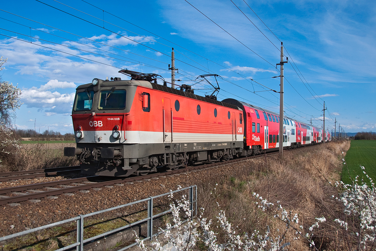 1144 008 mit REX 2832, am 29.03.2016 in frühlingshafter Stimmung, unterwegs auf der Franz Jofes's Bahn, kurz vor Absdorf-Hippersdorf.