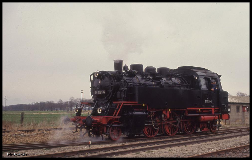 Dampf wie zu alten Zeiten am 10.4.1993 in der Altmark: 641491 setzt im Bahnhof Kalbe um.
