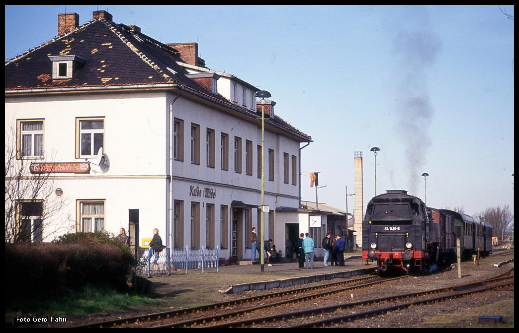 Dampf wie zu alten Zeiten am 10.4.1994 in der Altmark: 641491 vor dem P 6894 nach Hohenwulsch im Bahnhof Kalbe.