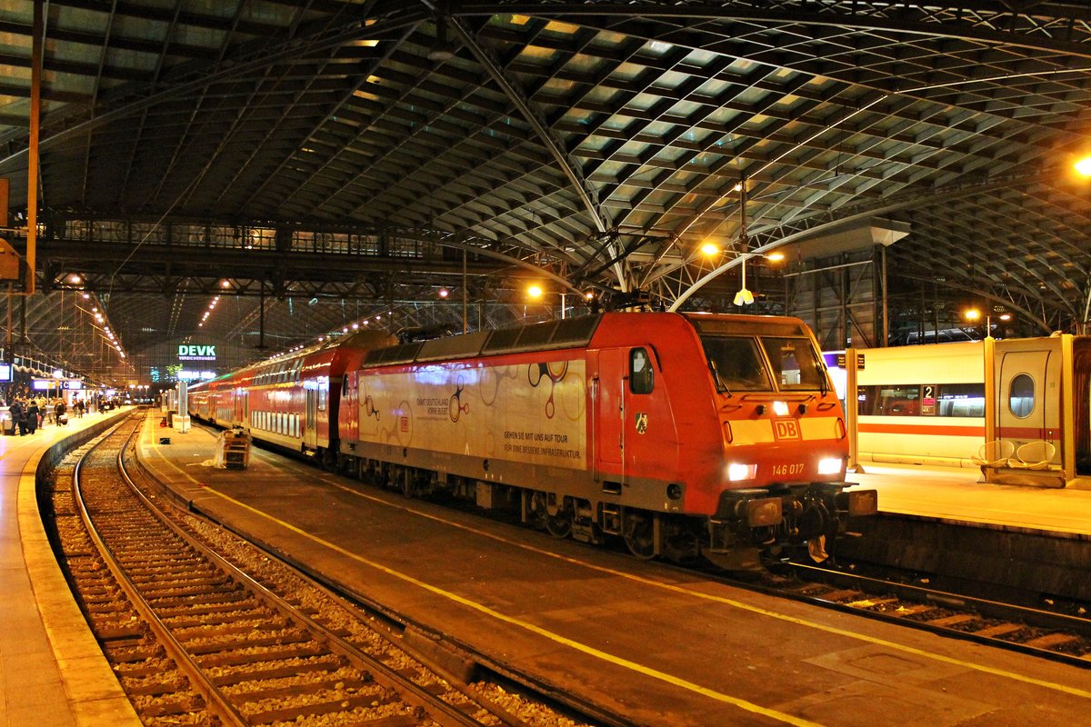 Mit einem Nahverkehrszug stand am späten Nachmittag des 05.01.2015 die 146 017 "Damit Deutschland vorne bleibt" im Hauptbahnhof von Köln und wartet auf die Ausfahrt.