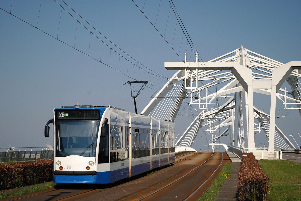 Tw. 2146 überquert die Brücke zwischen den Haltestellen Zuiderzeeweg und Steigereiland. (11.04.2016)