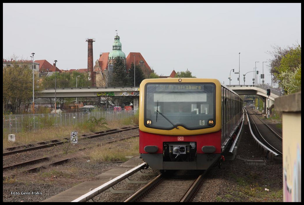 Am Besuchertag im Museums BW Schöneweide in Berlin am 23.04.2016 ergab sich vom BW Schöneweide aus dieser Blickwinkel auf eine in den S-Bahnhof Betriebsbahnhof Schöneweide einfahrende S-Bahn in Richtung Zeuthen / Schönefeld.