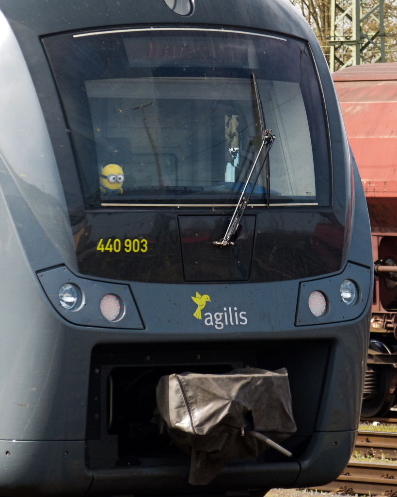 Ein Minion geht auf Reise und fährt den Zug der AGILIS den 440 903 gleich selbst. Plattling 03.04.2016