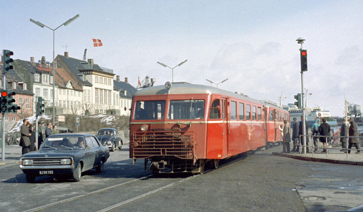 Helsingør-Hornbæk-Gilleleje-Banen: Die Endstation der HHGB befand sich zu der Zeit in einer Straße, und zwar im Jernbanevej (: "Bahnweg") zwischen dem damaligen Zollamt (links) und dem DSB-Bahnhof Helsingør (rechts außerhalb des Bildes). - Auf dem Foto hält ein HHGB-Zug bestehend aus dem Beiwagen Sp2 und einem Triebwagen des Typs Sm am 26. Mai 1969 im "Endbahnhof" in Helsingør. - Scan von einem Farbnegativ. Film: Kodacolor X.