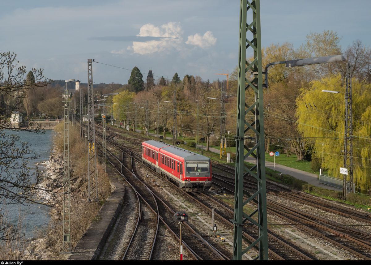928 415 verlässt am Abend des 4. April 2016 als RB 22732 nach Friedrichshafen Hafen den Bahnhof Lindau.