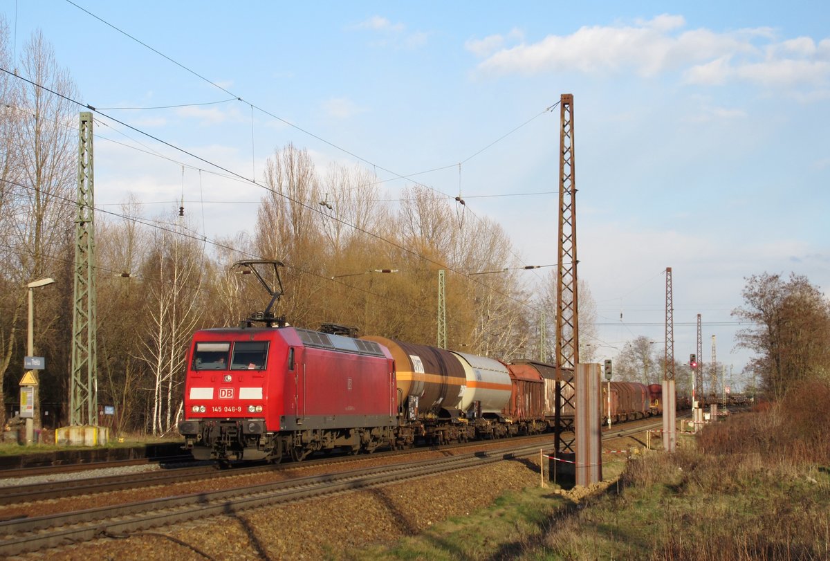145 046-9 zieht am 29.März 2016 einen gemischten Güterzug durch Leipzig-Thekla in Richtung Leipzig-Mockau.