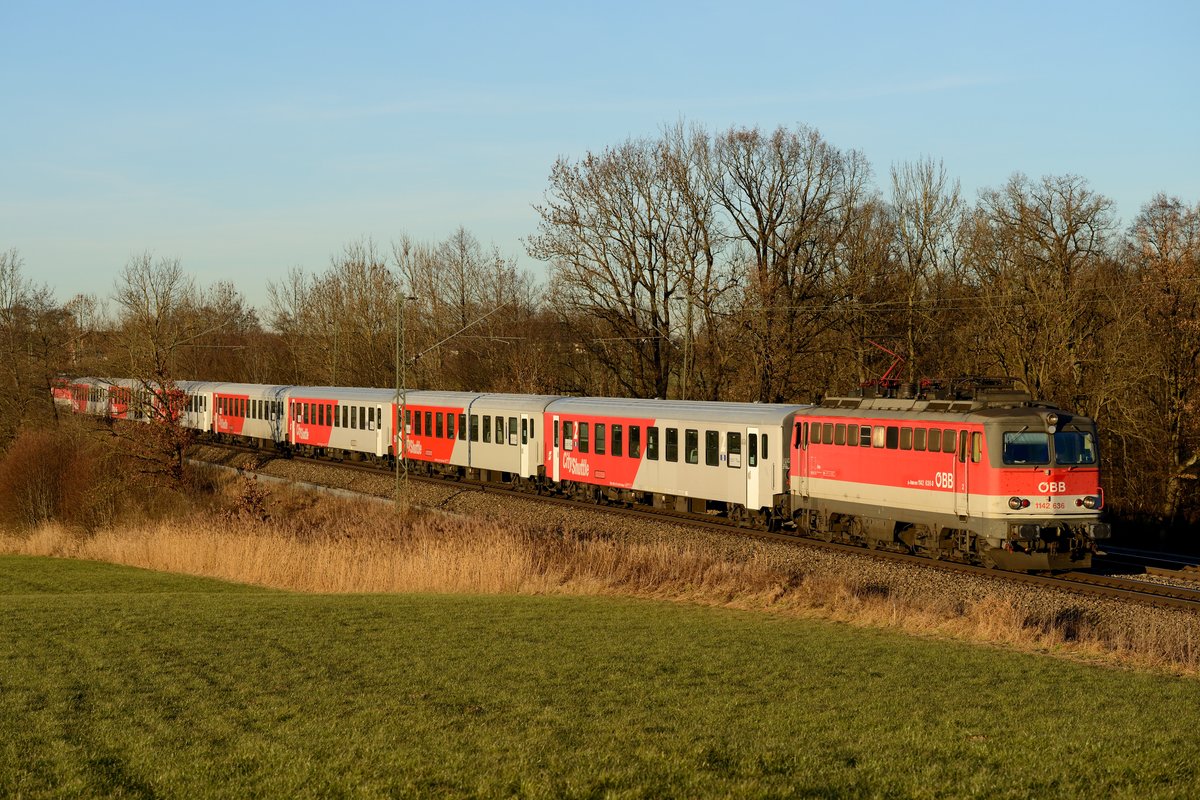 Im goldenen Abendlicht des 16. Dezember 2013 gelang dann noch diese Aufnahme des M 79025, geführt im Rahmen des Meridian Ersatzzug-Konzeptes mit einer ÖBB CityShuttle Garnitur. Zuglok war die 1142.636, zum Aufnahmezeitpunkt seit kurzem mit PZB90 ausgerüstet und somit wieder auf deutschen Schienen zugelassen und einsetzbar.