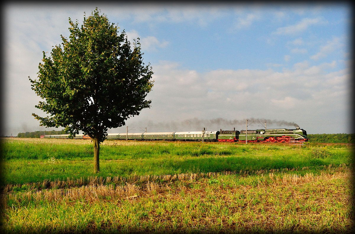 18 201 mit dem Sonderzug zu den Störtebeker Festspielen nach Bergen auf Rügen. Bei Delitzsch am 13.08.2016.
