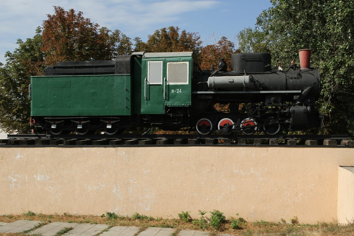 Auf dem Geländer der Kinderbahn von Zaporoshje am 7 August 2016 steht dies olle Dampflok.