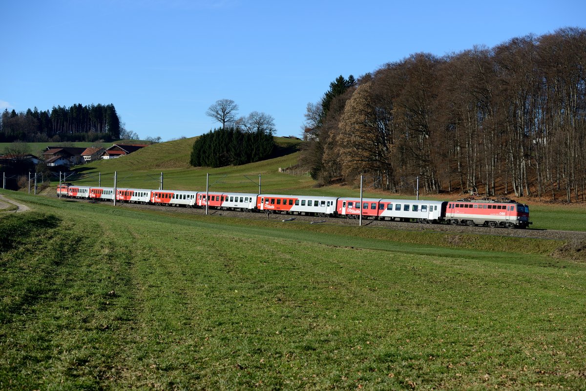 Nach einer kurzen Wende in Salzburg fuhr der ÖBB CityShuttle als Meridian Ersatzzug M 79024 nach München zurück. Diesmal ist 1142.644 führend, aufgenommen am 17. Dezember 2013 bei Axdorf vor imposanter Baumkulisse.