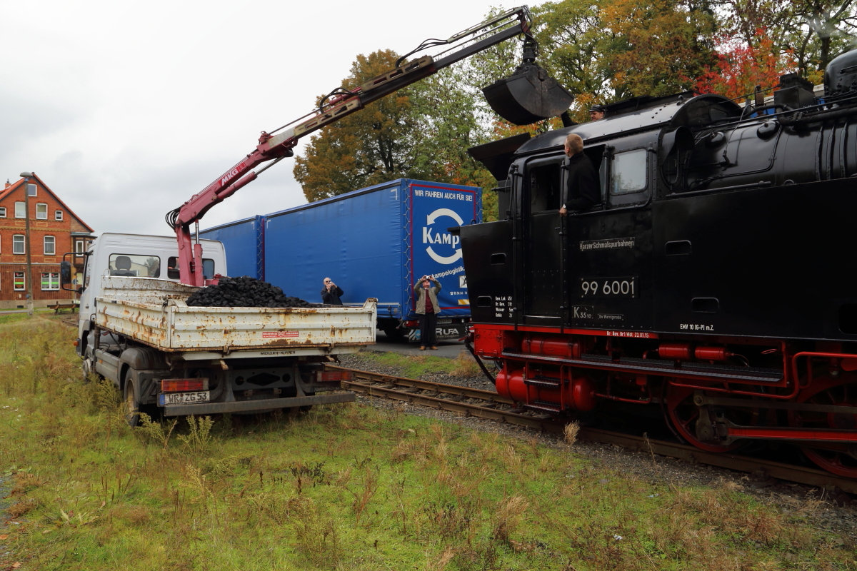 Bekohlung von 99 6001, im Rahmen einer Sonderzugveranstaltung der IG HSB, am Nachmittag des 18.10.2015 im Bahnhof Harzgerode. (Bild 3)