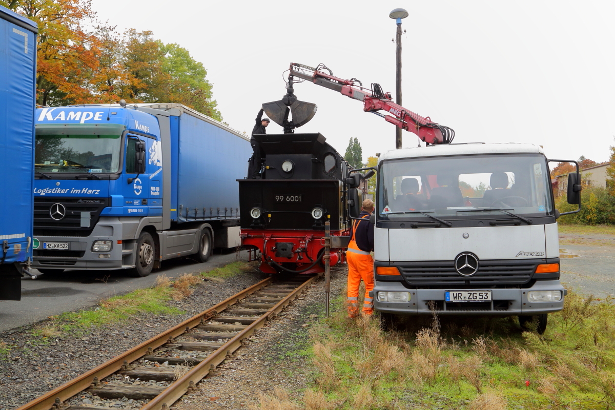 99 6001 mit IG HSB-Sonderzug am 18.10.2015 auf Gleis 2 im Bahnhof Harzgerode. Die Lok wird hier abgekuppelt und verläßt für eine Weile den Zug, um vom LKW aus mit Kohle versorgt zu werden.