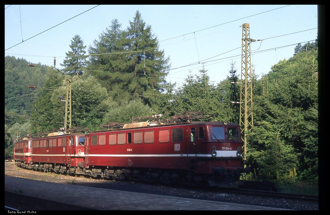 Gleich drei Loks der Reihe 171 standen am 20.8.1996 im Bahnhof Rübeland. 171014, 171004 und 171008 warteten auf den nächsten Einsatz.