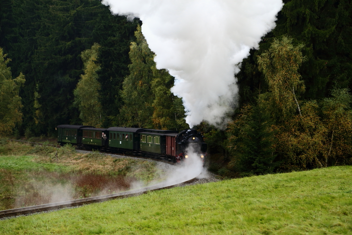 Zur Vorbereitung einer letzten Scheinanfahrt im Rahmen einer Sonderzugveranstaltung der IG HSB am 18.10.2015, setzt 99 6001, kurz vor dem Haltepunkt Sternhaus-Haferfeld, mit ihrem Zug ein Stück zurück.