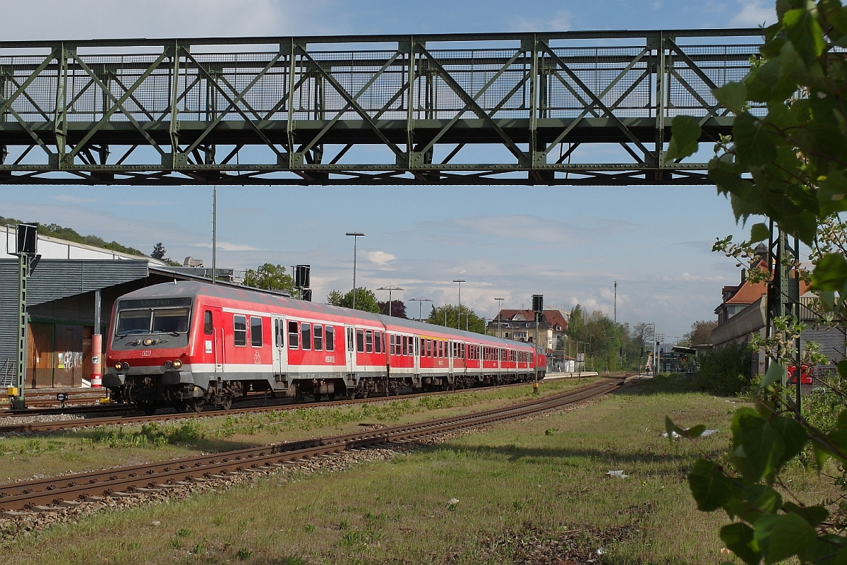 Auf der Fahrt von Aalen nach Friedrichshafen ist 218 412-5 mit dem RE 3239 am 17.05.2016 gerade im Bahnhof Bad Schussenried abgefahren.