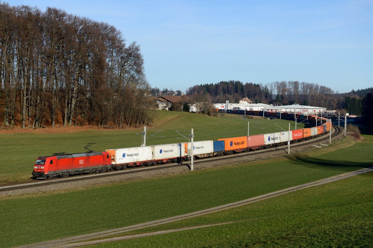 Auch der Alltagsverkehr kann seine Reize haben: Der im Block folgende Containerzug KT 41814 von Salzburg Gnigl nach Alte Süderelbe war aufgrund seiner Länge optimal für die Fotostelle bei Axdorf. Am 21. Dezember 2013 führte 185 082 den Zug über den gesamten Laufweg.