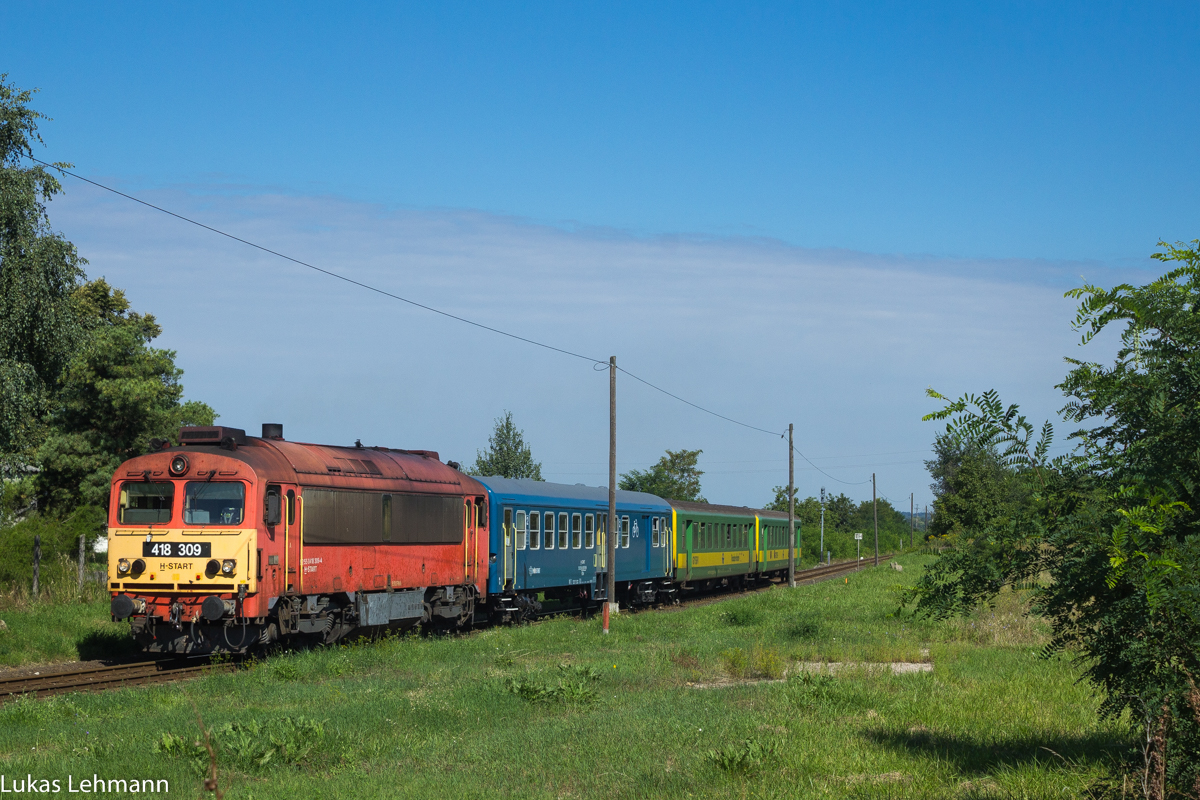 Die 418 309 fährt ihren Personenzug in den Bahnhof von Vasútállomás ein, 12.08.2016