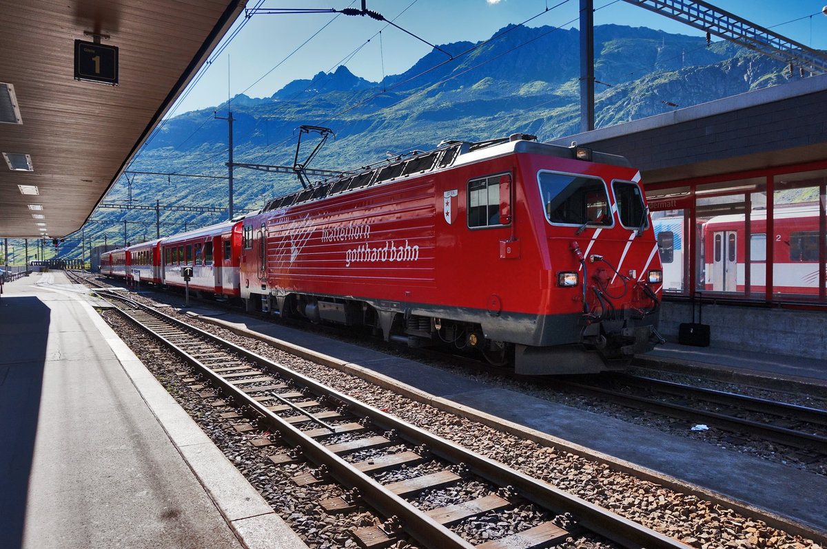 HGe 4/4 101 "'Ville de Sion/Sitten" steht mit dem R 856 nach Disentis/Mustér, abfahrtbereit im Bahnhof Andermatt. Aufgenommen am 20.7.2016.