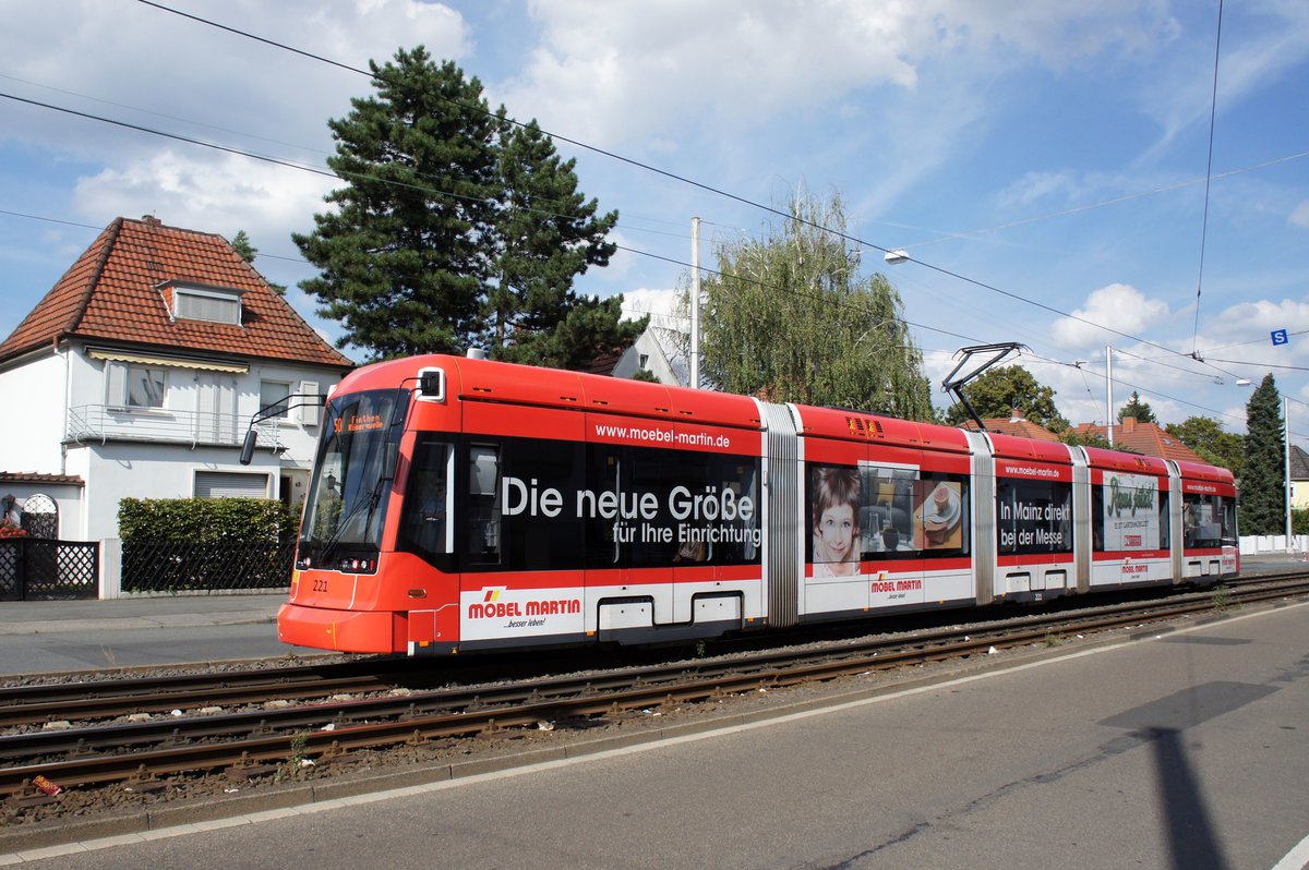 Straßenbahn Mainz: Stadler Rail Variobahn der MVG Mainz - Wagen 221, aufgenommen im August 2016 in Mainz-Gonsenheim.