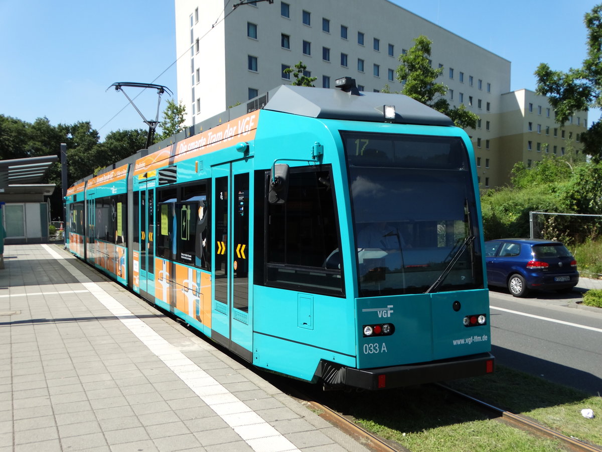 VGF R-Wagen 033 ist der erste der in Zusammenarbeit mit Siemens modernisiert wurde. Dies kann man an den neuen LED Frontscheinwerfern erkennen. Hier am 17.08.16 in Frankfurt Rebstockbad