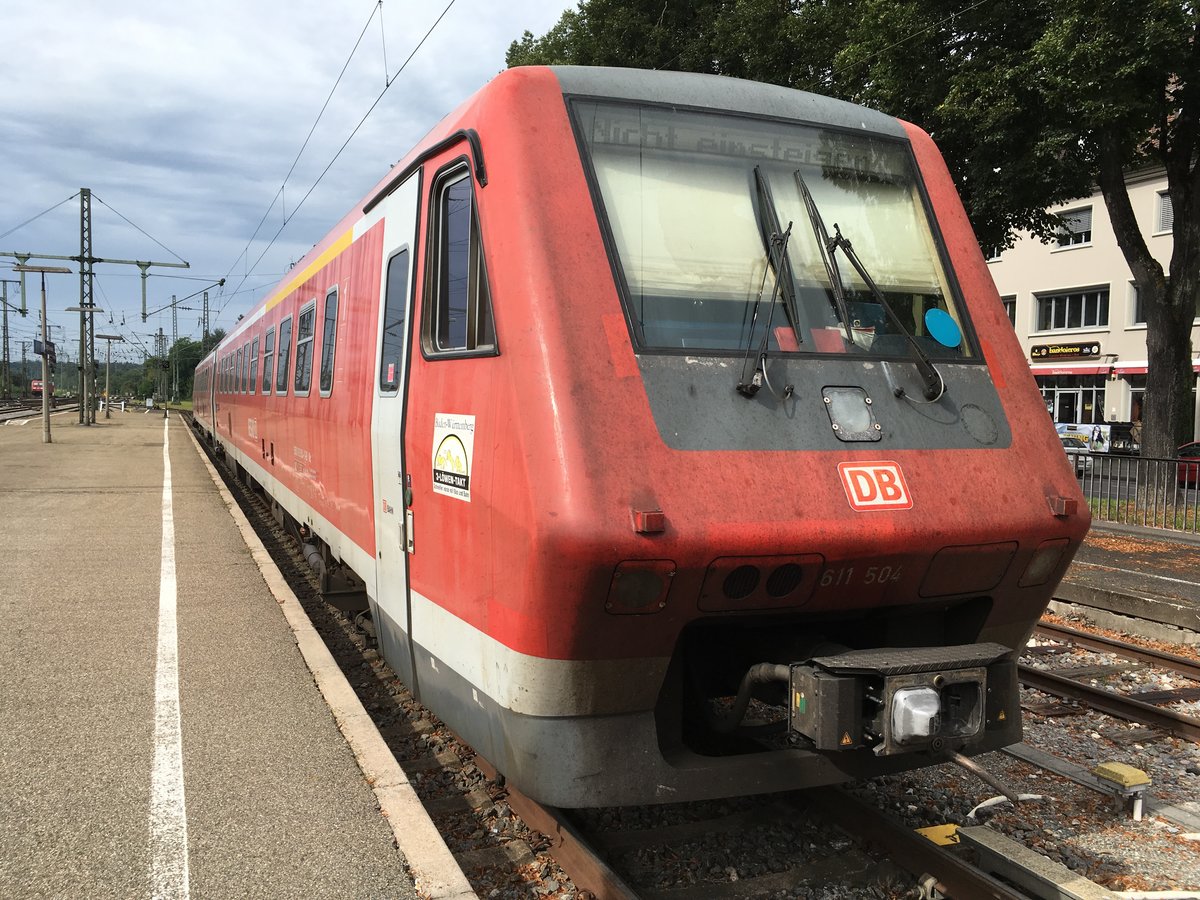 Der Außenzustand von 611 004 hatte wohl auch schon mal bessere Zeiten wie am 20.08.16 wo er abgestellt im Bahnhof von Singen (Htw) stand.