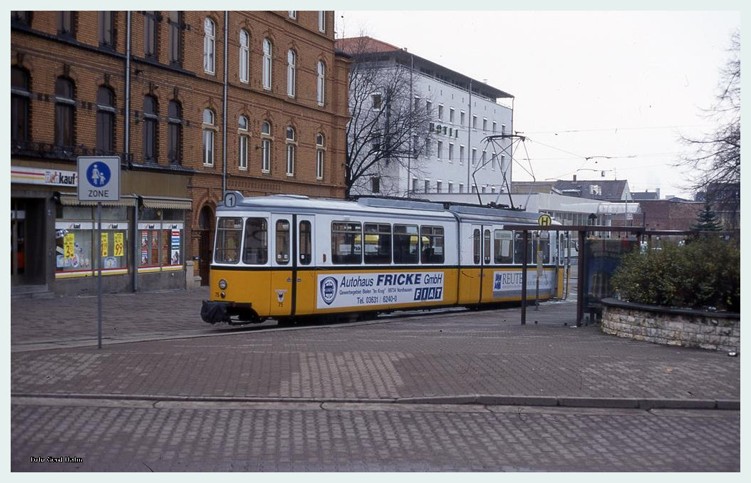 Eine ex Stuttgarter Straßenbahn steht hier am 24.11.1996 als Tram 75 am Bahnhof Nordhausen. Die alte Stuttgarterin wurde hier auf der Linie 1 eingesetzt.
