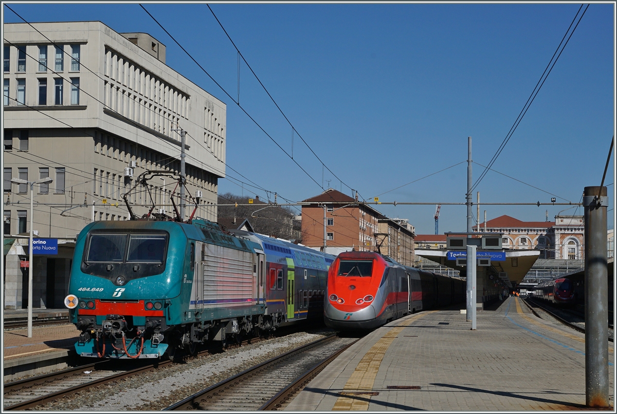Die FS E 464.649 und ein FS ETR 500 "Frecciarossa" in Torino Porta Nuova am 1. März 2016.