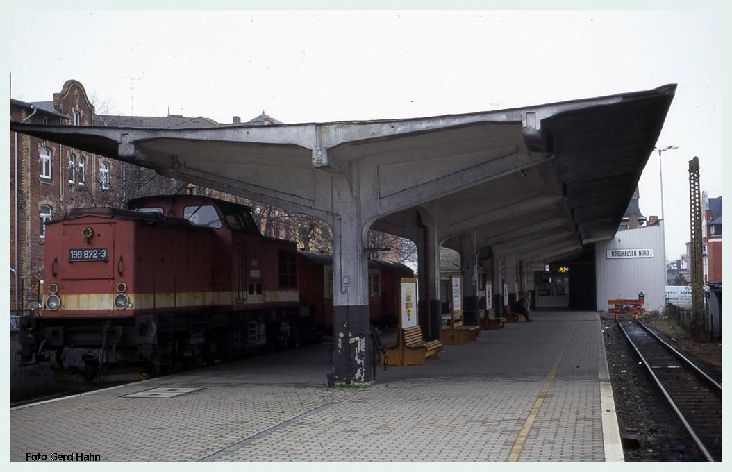 So gerade passt 188872 unter das alte Bahnsteigdach im schmalspurigen Bahnhofsbereich von Nordhausen. Am 29.11.1996 herrschte hier noch altes Reichsbahn Flair.