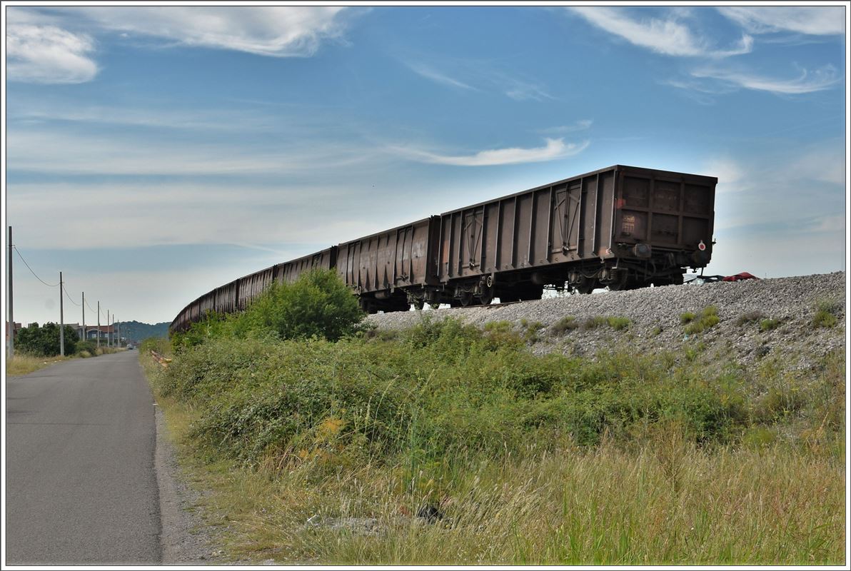 Der Kohlezug nach Albanien rauscht vorüber. Wegen stockendem Verkehr in der nachfolgenden Stadt Tuzi habe ich den Zug verloren. Die Strecke von Tuzi nach Hani Hotit verläuft vielerorts in Tunneln, während die Strasse über den Berg führt. (03.08.2016)