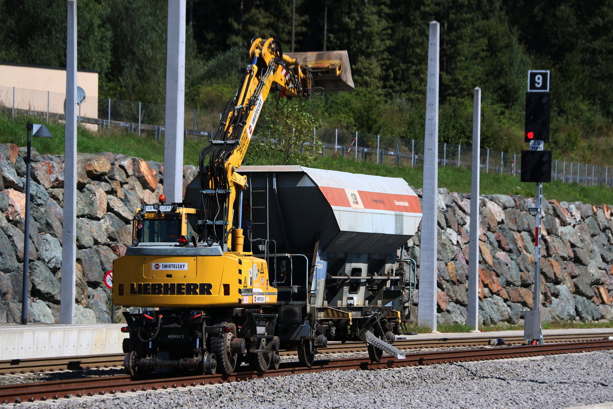 Auf der Koralmbahn wird fleißig gebuddelt. Am 23.August 2016 ist ein 2 Wege Bagger mit einem TDS dabei überschüssigen Schotter zu entfernen. Hier in Hengsberg wurde in den letzten Wochen das 2te Streckengleis im zugehörigen Hengsbergtunnel verlegt.