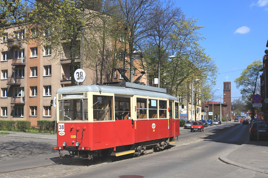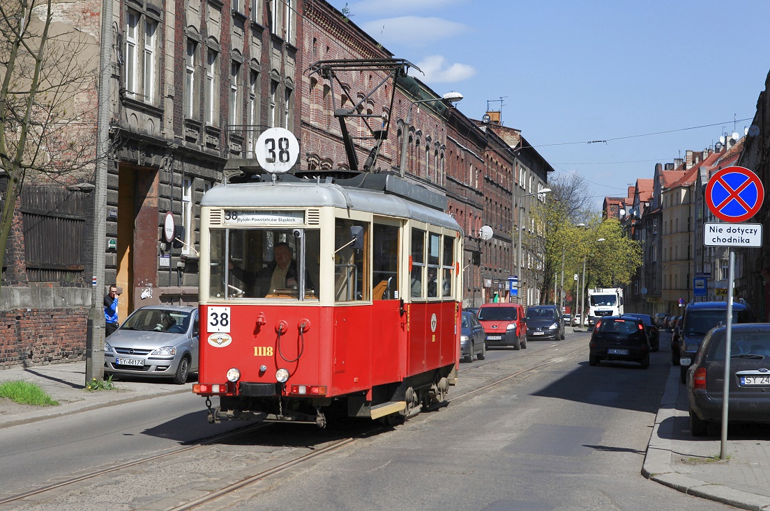 Straßenbahn Schlesien: in Bytom laufen noch Zweiachser auf der kurzen Linie 38, die linienmäßig nicht an die anderen Linien in der Stadtmitte angebunden ist. Es gibt jedoch eine Gleisverbindung, wobei der Wagen beim Einrücken ins Depot eine Einbahnstraße gegenläufig befahren muss. Aufnahme in der Ulica Piekarska, Tw 1118, 26.04.2016.