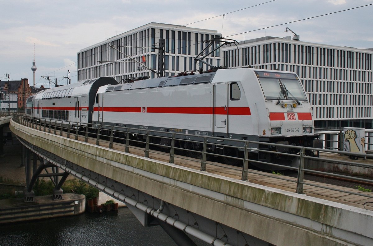146 575-6 ist am 31.7.2016 mit dem IC2431 "Borkum" von Emden Außenhafen nach Cottbus unterwegs, soeben wird der Berliner Hauptbahnhof verlassen.