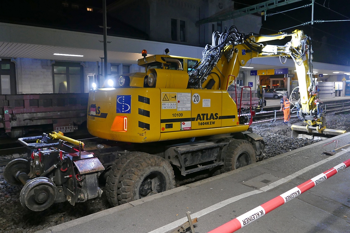 Nachts im Bahnhof Konstanz - Der von der Firma SPITZKE eingesetzte Zweiwegebagger ATLAS 1604KZW schaufelt den Gleisschotter unter der inzwischen entfernten Weiche von Gleis 2 in die bereitgestellten Flachwagen (06.08.2016).