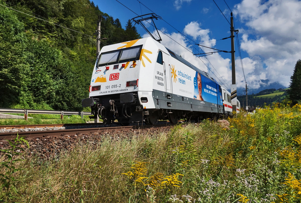 Am 9. August 2016 ist 1144 074 bei Kaiserwetter mit dem EC 151 "Emona" (Wien Hbf - Ljubljana) auf Höhe des Alpenstromkraftwerkes Peugen, welches rund 14.500 Haushalte mit Strom versorgt, unterwegs.