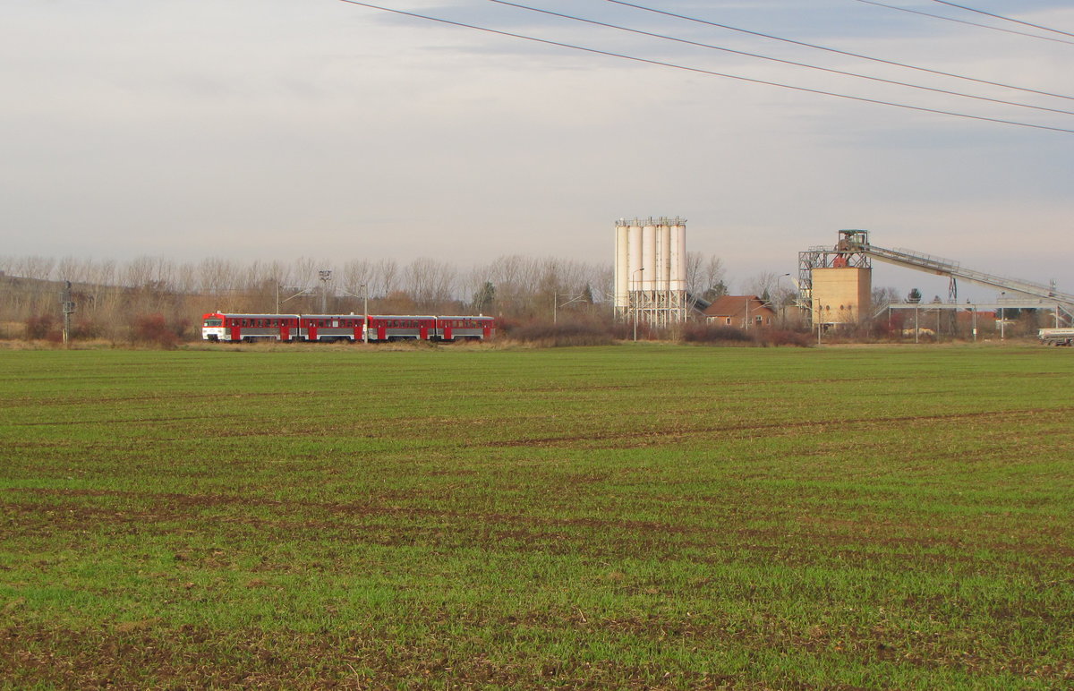 Der Triebzug mit dem Vorausfahrenden Steuerwagen der Baureihe 6645.02 aufgenommen in der Alberndorf an der Pulkau. (10.12.2016)