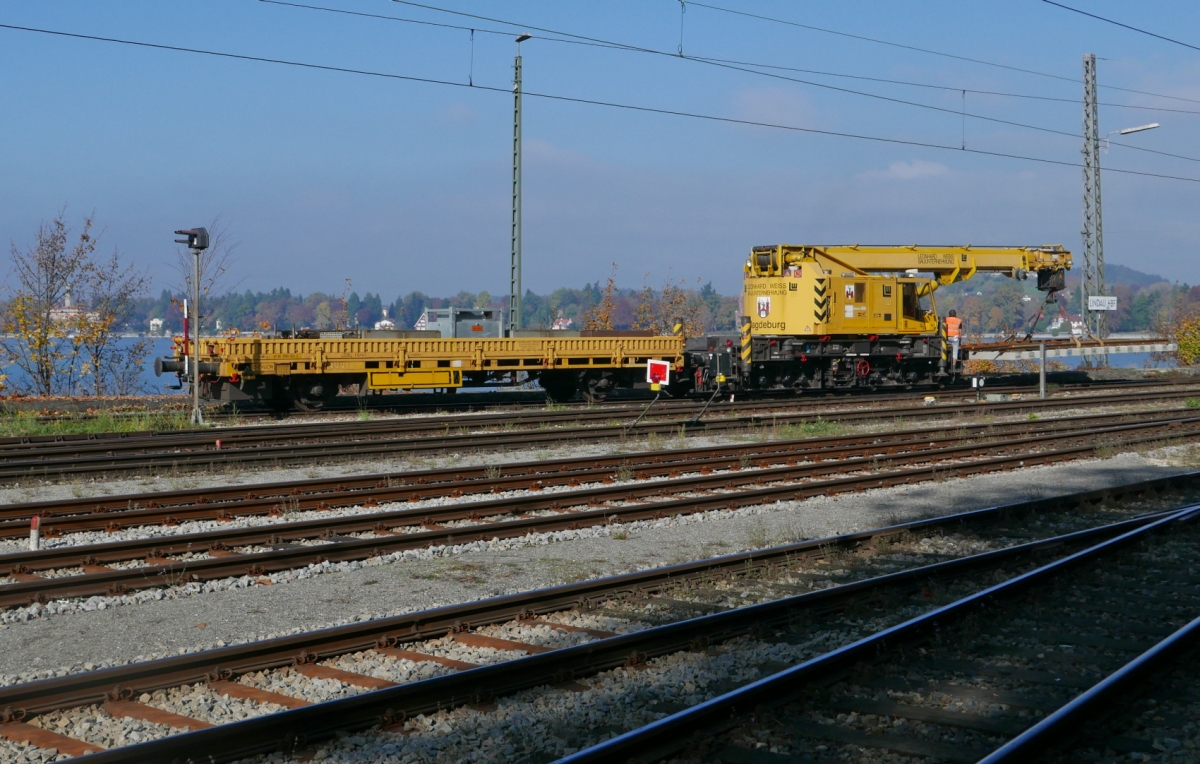 Weichenerneuerung auf dem Bodenseedamm in Lindau (|V) - Gleisbauschienenkran KRC 450 T 'Magdeburg' von Leonhard Weiss (97 82 52 501 19-9) setzt am 29.10.2016 ein Weichenteil in die vorbereitete Stelle ein.