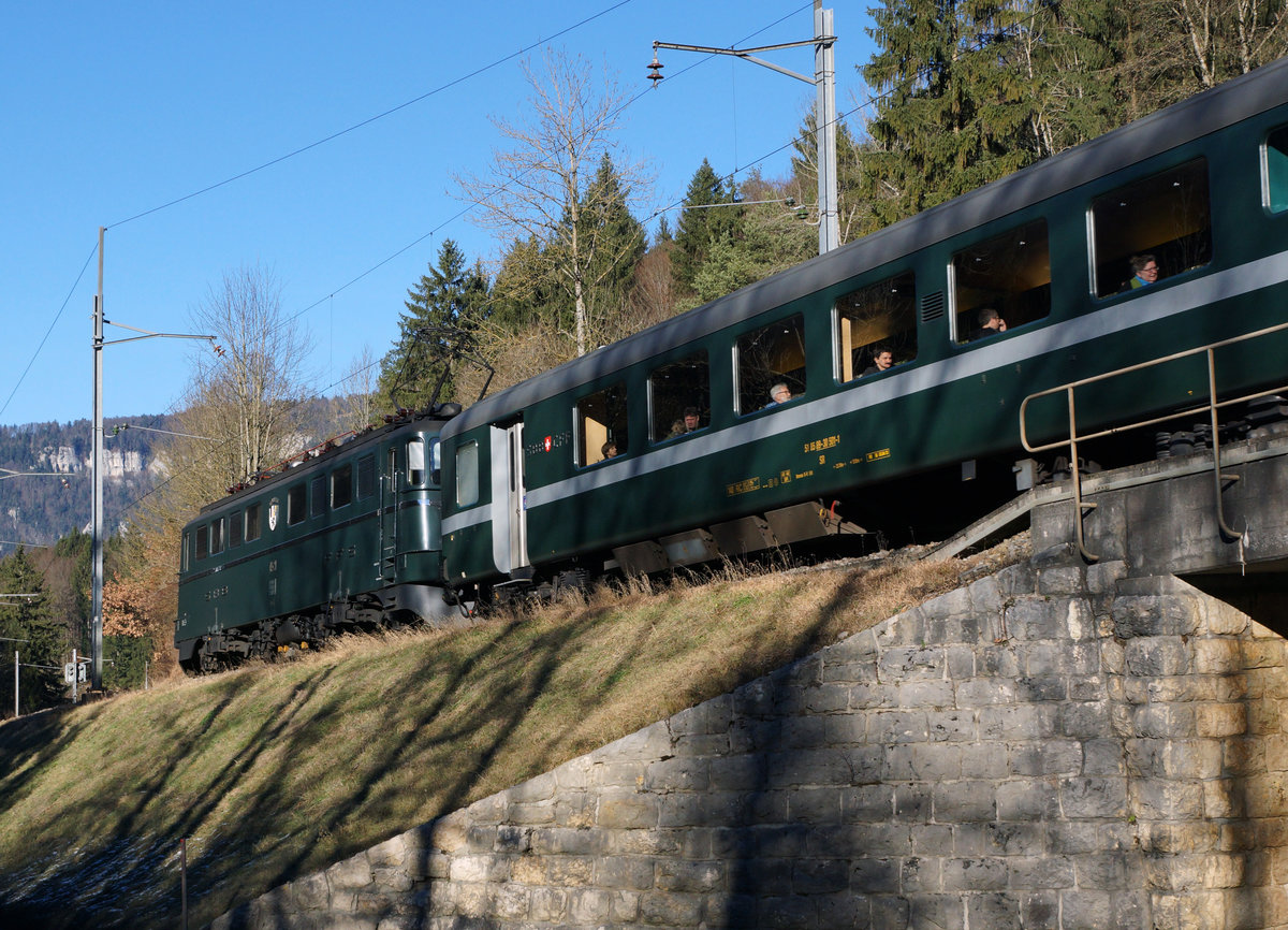 Der Sonderzug schlängelt sich neben Strasse und Fluss durch die enge Schlucht zwischen Gänsbrunnen und Corcelles mit sehr wenig Sonnenlicht zu dieser Jahreszeit.
